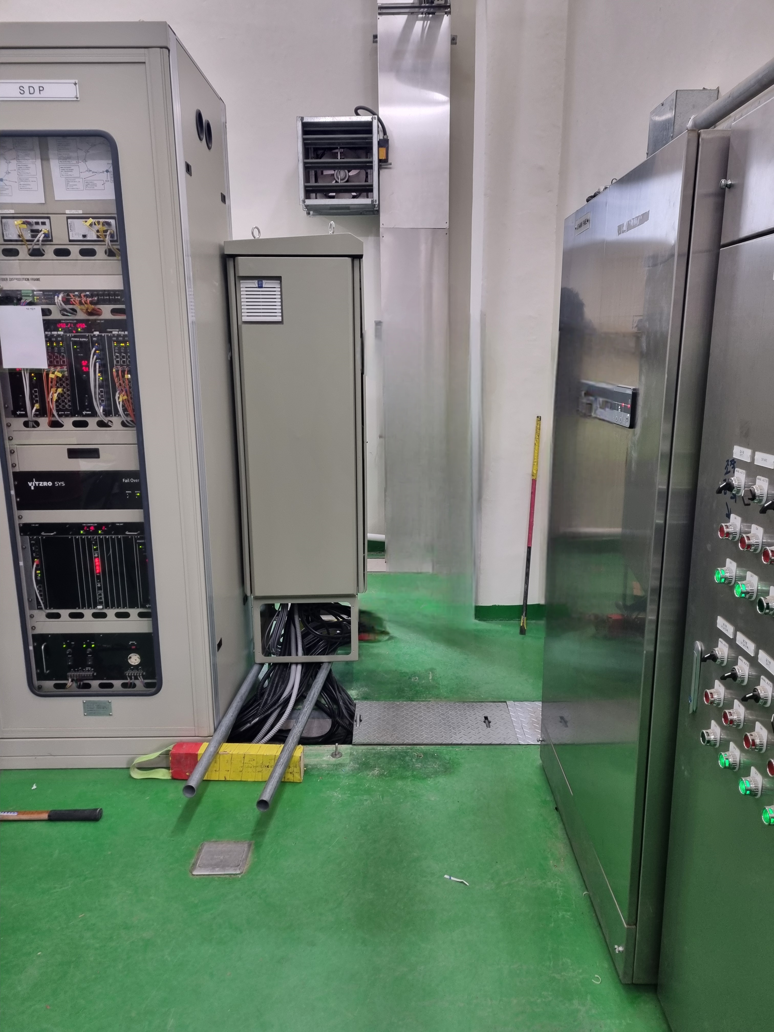 - 2층 또는 1층 에 위치한 통신실에서 1층의 고장기록장치반 자사 판넬까지 통신선 포설 과정이며 SS에 비하여 상대적으로 간단하다. 2층에서 내려오는 경우 몰딩처리 or 후렉시블 노출배관하며 1층에서 오는 경우 바닥배관으로 그대로 이동하면 된다.