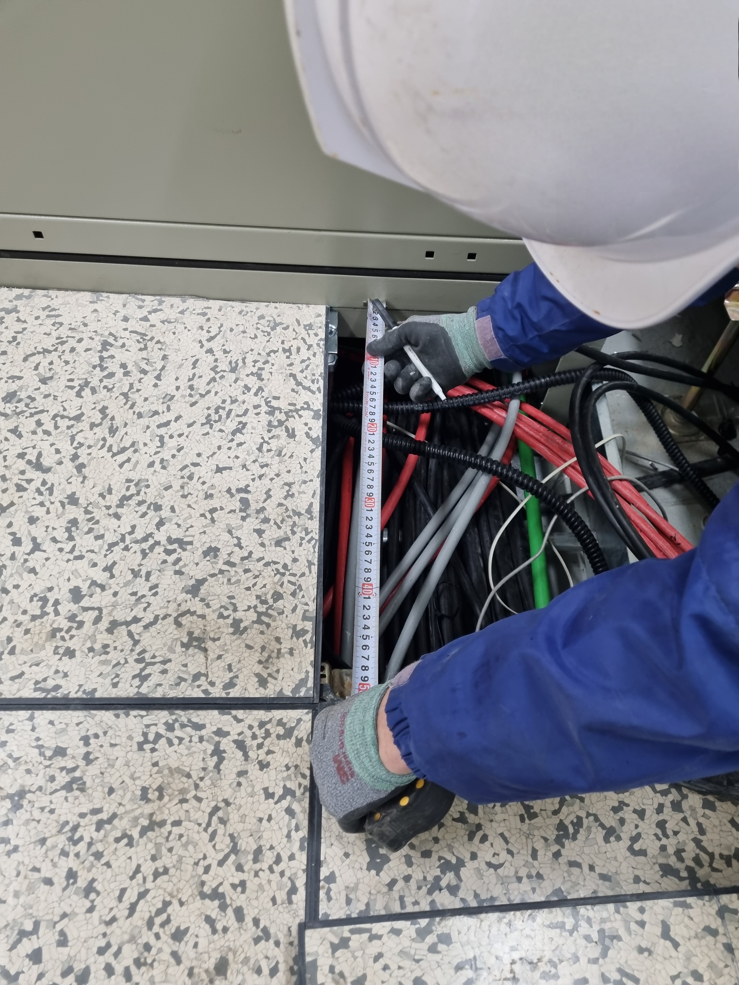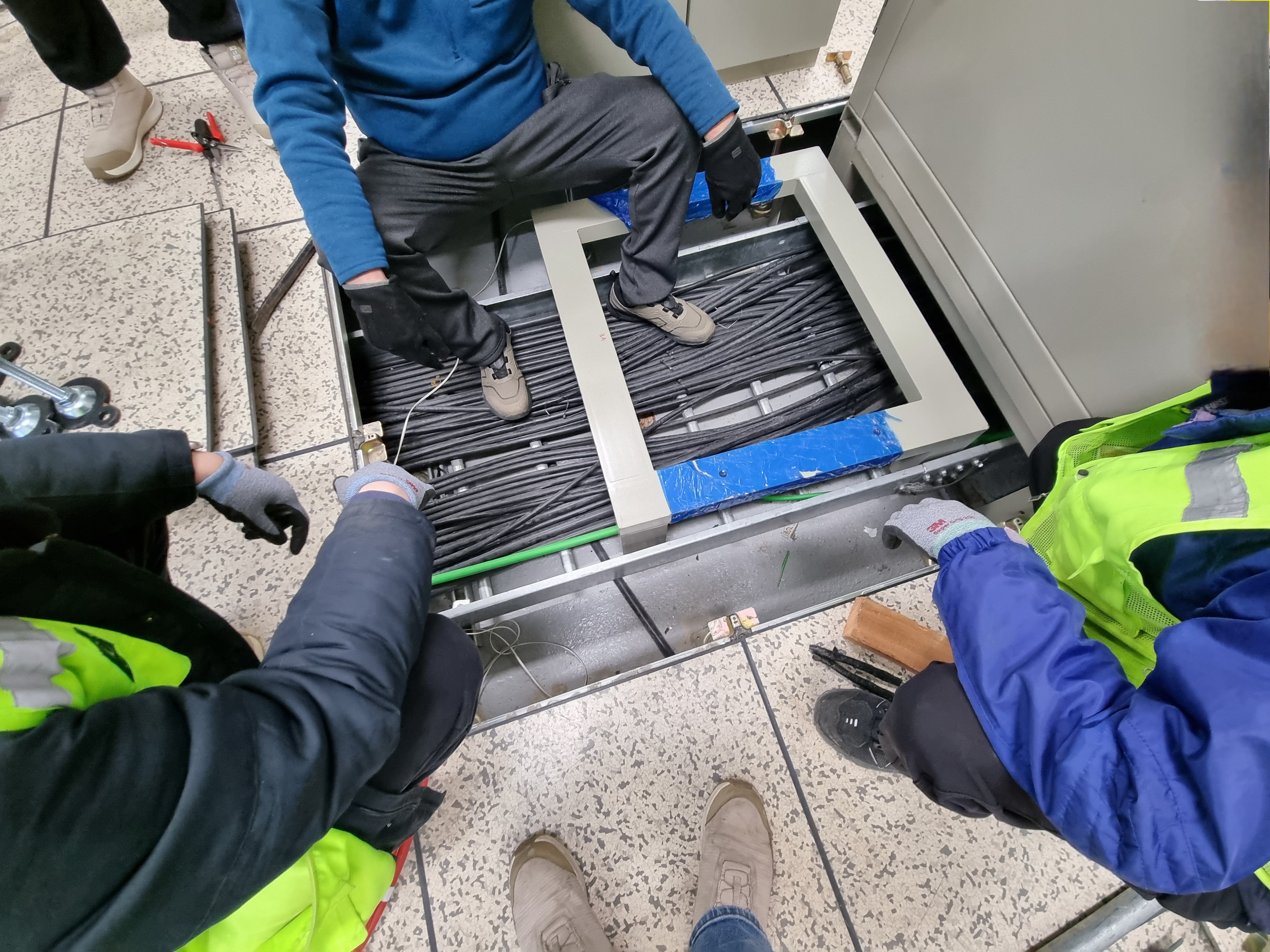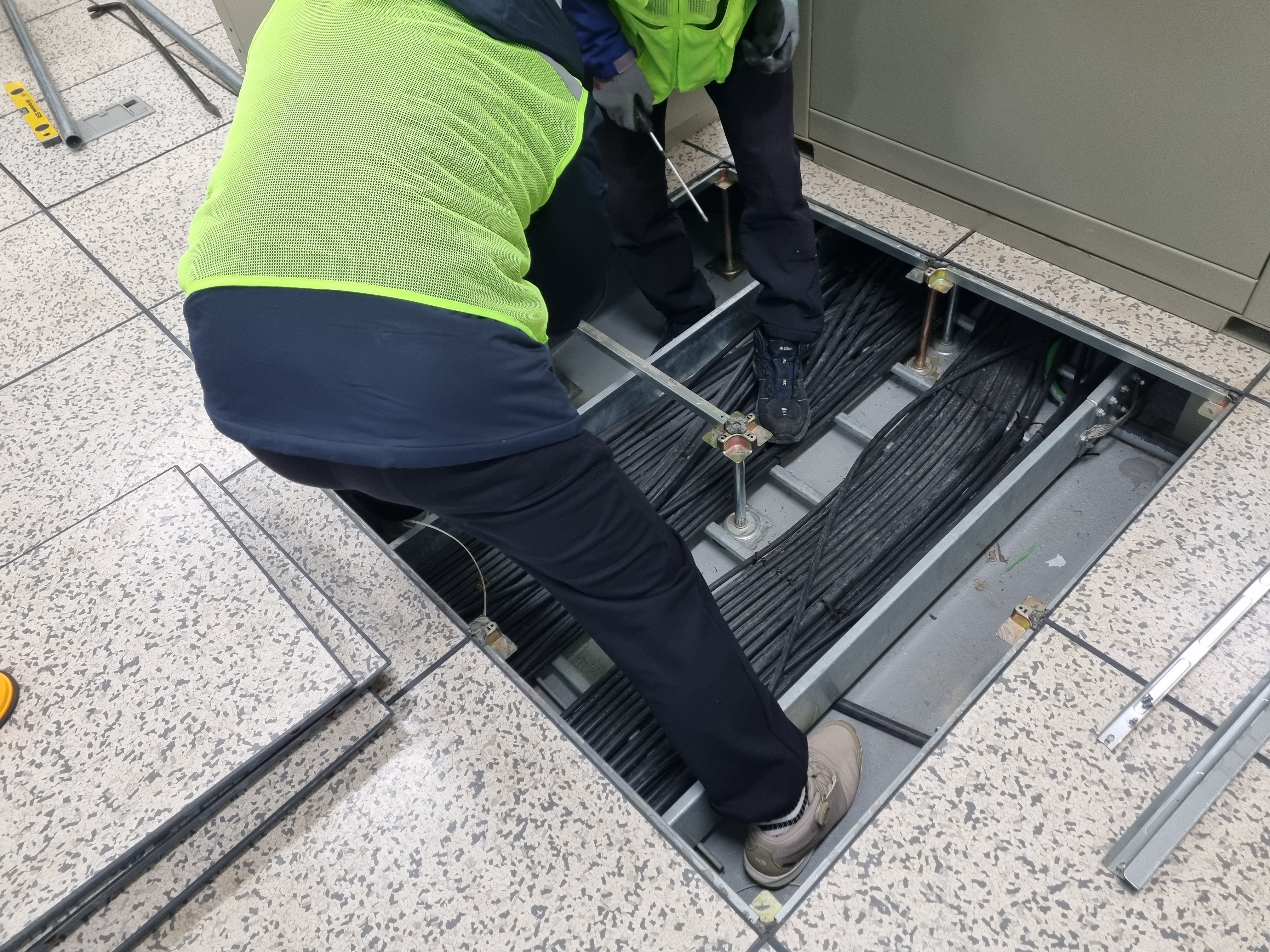 흡착기로 액세스 플로어 타일 일부 철거(AT라인의 경우 트렌치 철거,1~2층 사이의 경우 트레이 커버 철거) 후 트레이 라인을 따라 필요한 전선을 포설한다. 포설 후 타이로 정리, 트레이 밑으로 내려가는 전선 여장 넉넉하게 확보할 것.